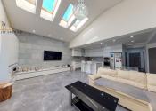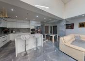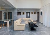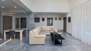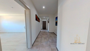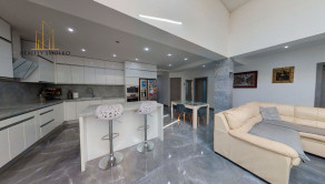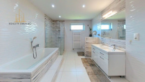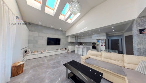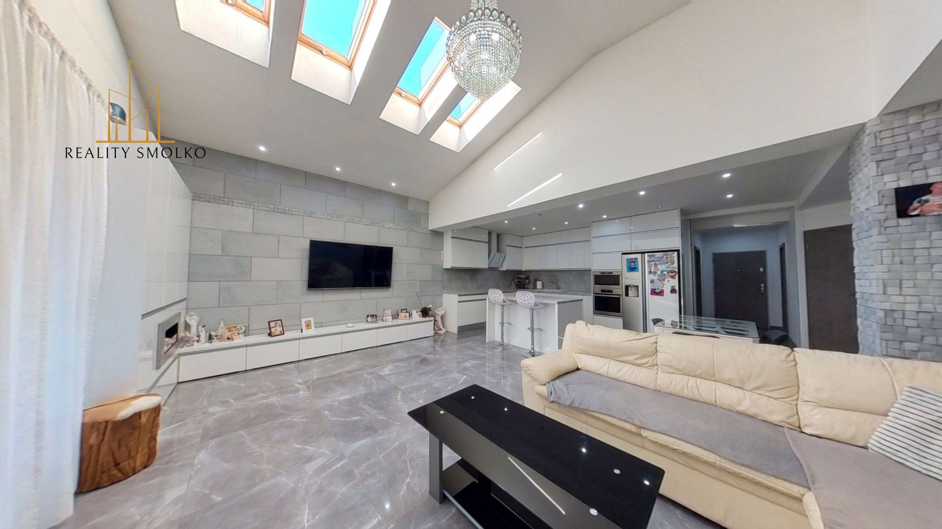 -pozostáva z veľkej luxusnej obývačky, kde je využitý koncept prepojenia obývačky s kuchyňou, odkiaľ